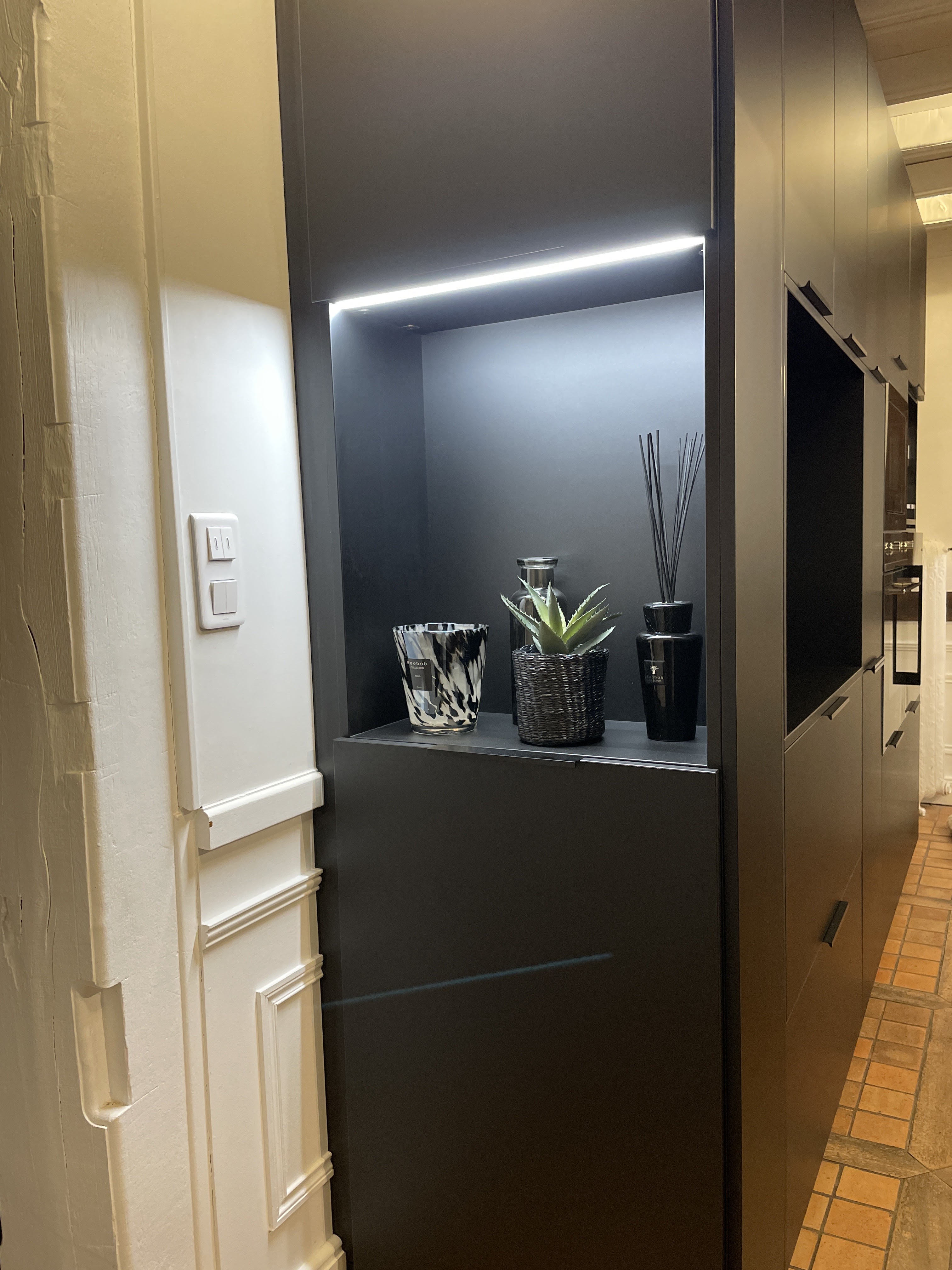 Ravis de cette réalisation qui s’adapte parfaitement à notre pièce de vie. Nous avions des attentes spécifiques et Nicolas Hubert a su nous accompagner et nous conseiller pour concevoir ce projet notamment avec des plans en 3D. Les délais de livraison et d’installation ont été parfaitement respectés et la coordination entre les intervenants (Electricien) s’est très bien déroulée. Le poseur Fabien a su respecter les contraintes techniques de la pièce. Le résultat est tel que nous l’imaginions.